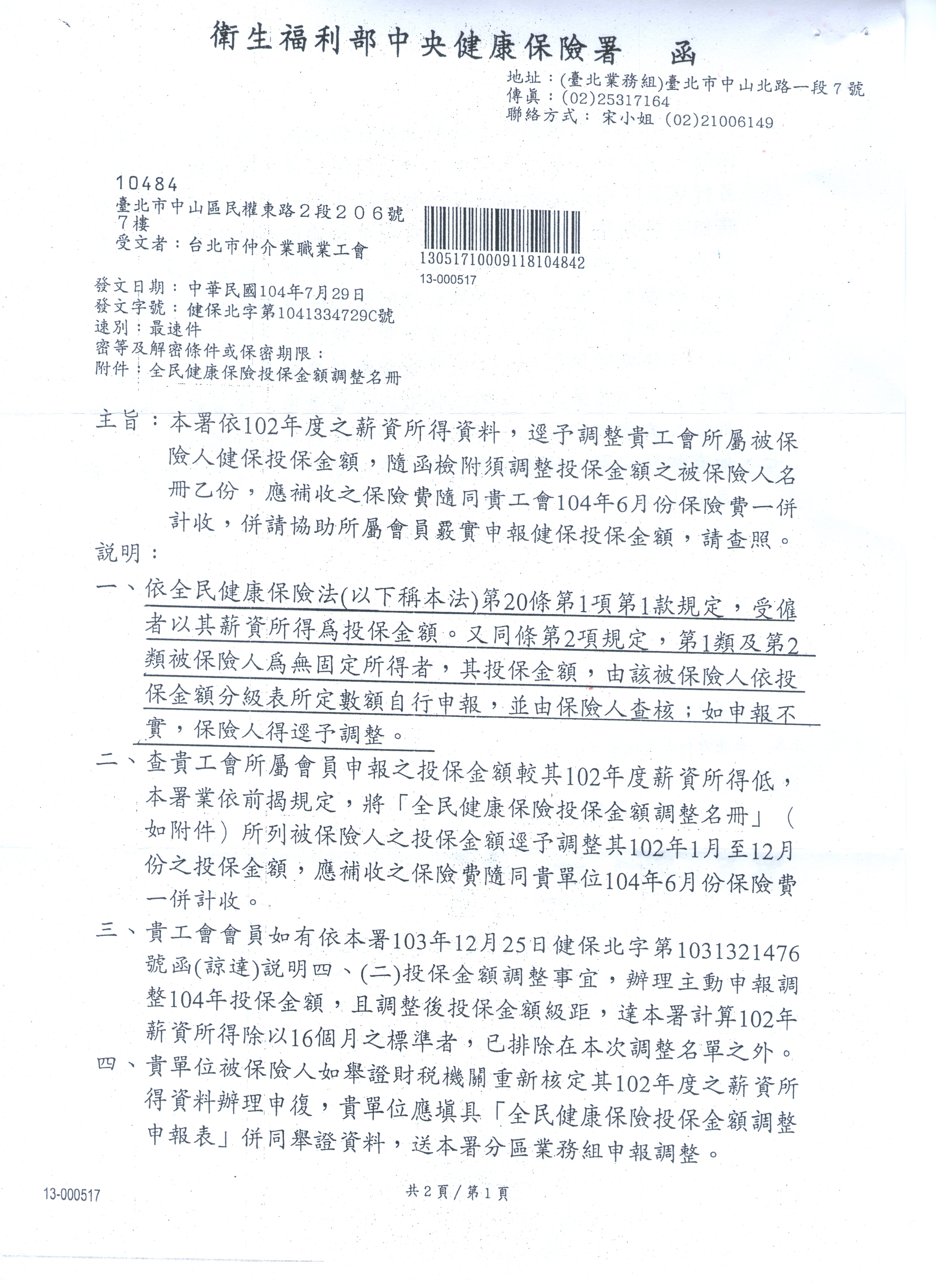 健保局通知102年度薪資所得逕調公文,詳附件!