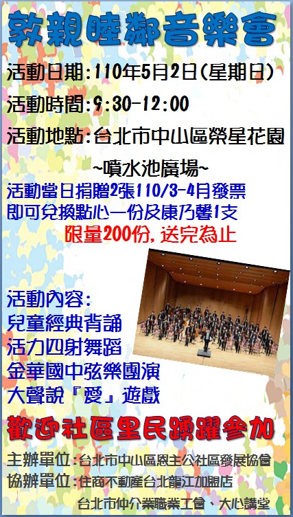 《敦親睦鄰音樂會》歡迎社區里民踴躍參加,五月二日(週日)9:00~12:00。榮星花園-噴水池廣場。